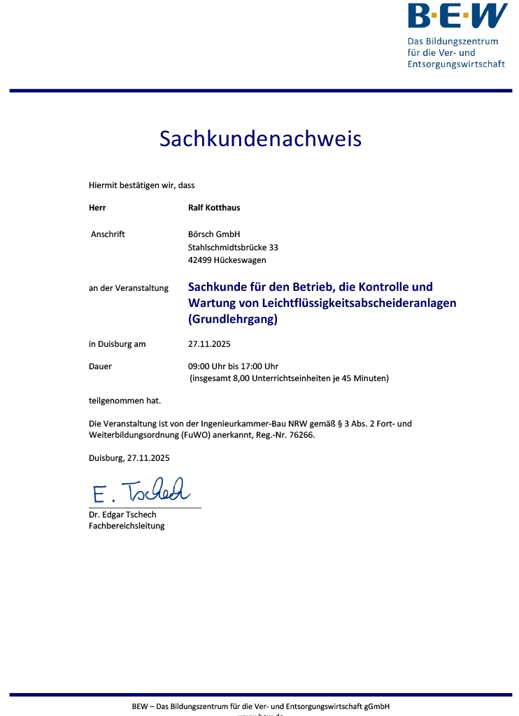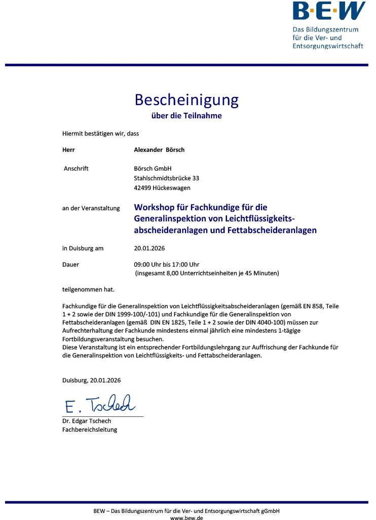 Zertifikat Prüfung Leichtflüssigkeits- und Fettabscheideanlagen - Alexander Börsch