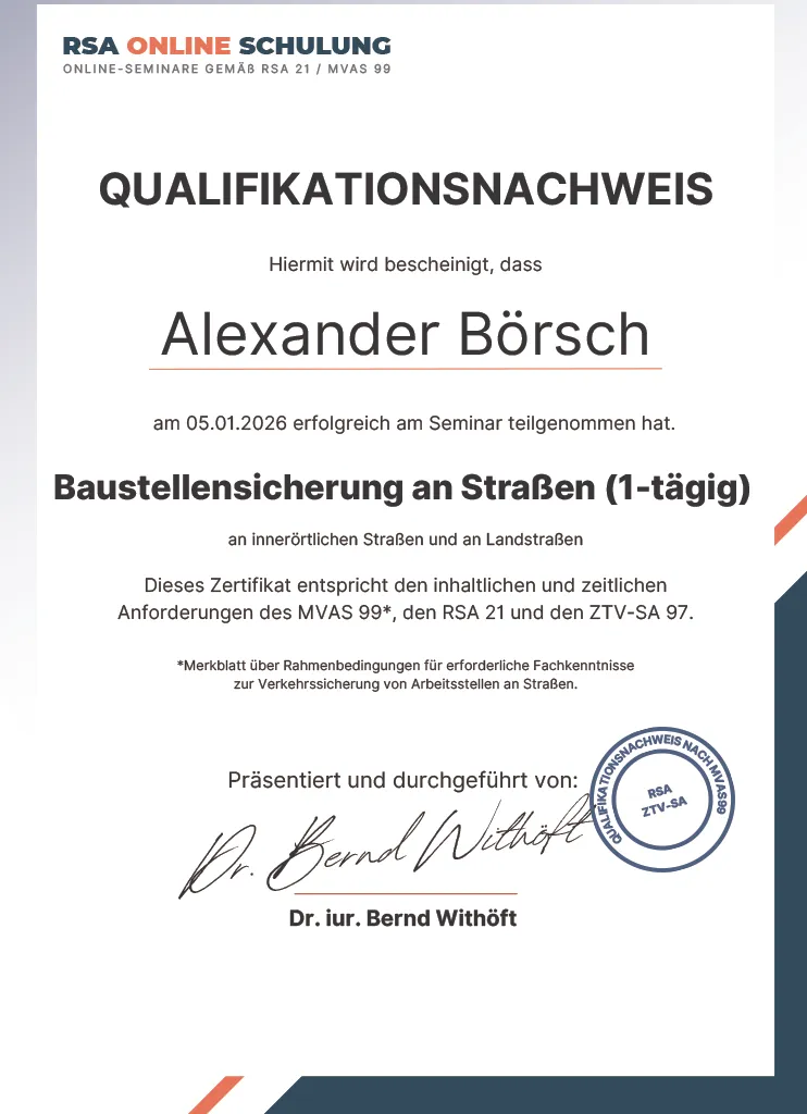 Teilnehmerzertifikat Baustellensicherung Alexander Börsch