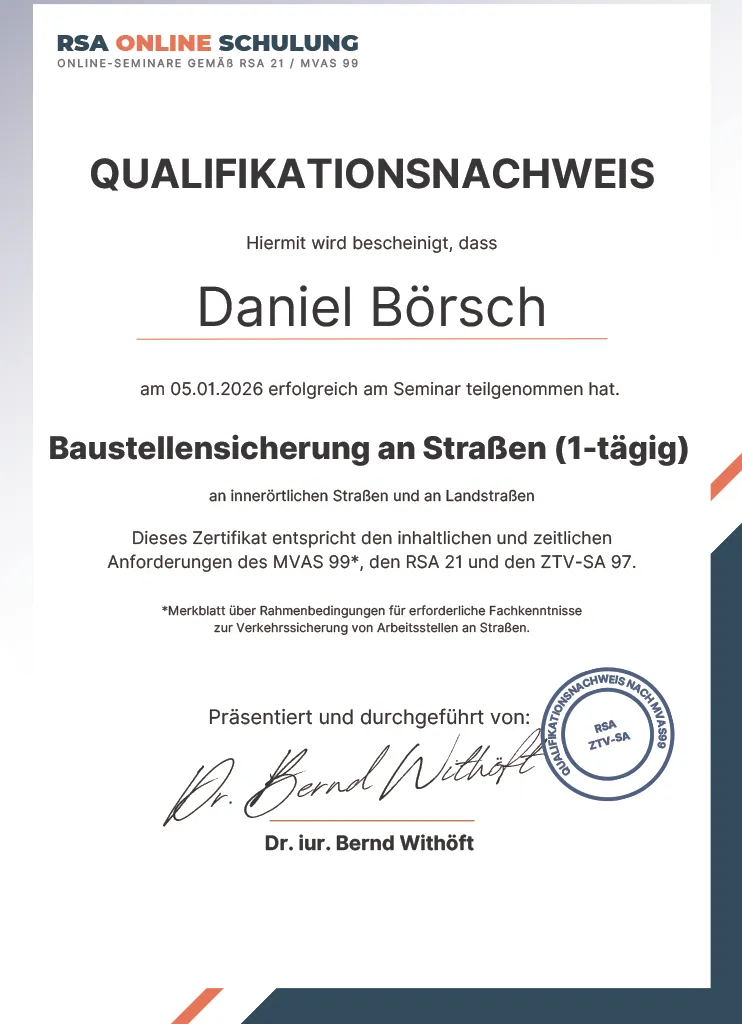 Teilnehmerzertifikat Baustellensicherung Daniel Börsch