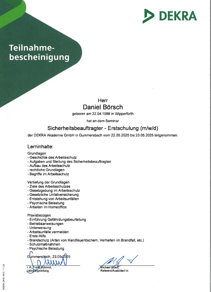 Zertifikat Daniel Börschl Sicherheitsbeauftragter