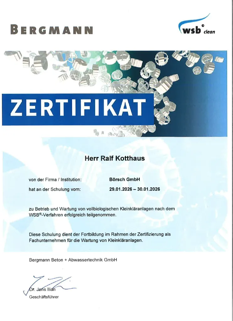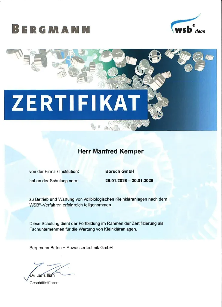 Fachkundenachweis Neubau, Nachrüstung und Sanierung Kleinkläranlagen - Daniel Börsch