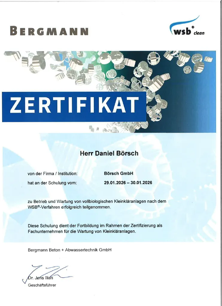Zertifikat Daniel Börsch Betrieb & Wartung Kleinkläranlagen